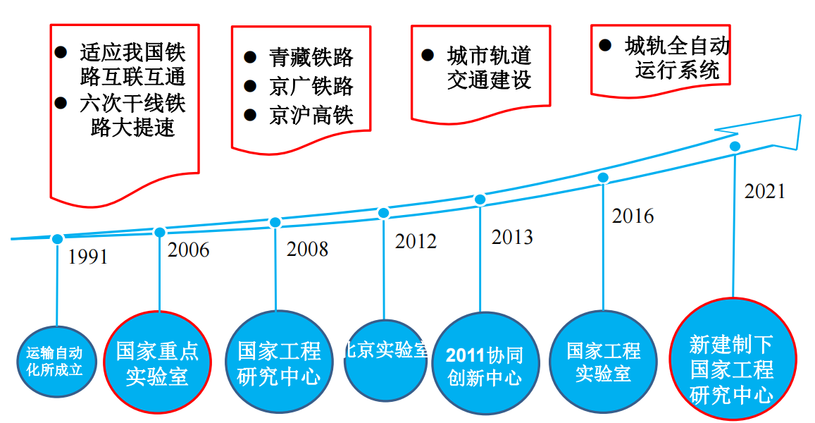 在汪希时教授、宁滨院士、唐涛教授、蔡伯根教授等带领下,研究所建立起了包含理论研究、技术攻关、产品研发、团队建设和国际交流五位一体的协同创新架构,成功践行政产学研用协同创新模式,取得了数字化通用式机车信号、CBTC、FAO、青藏铁路卫星导航定位应用等一系列重大成果,在列车运行控制系统成套自主化装备研制及应用推广方面取得了一系列重大成果,持续引领我国轨道交通信号领域技术创新。经过30年的艰苦努力,已经由一个教研室发展成为我国铁路信号领域重要的研究团队,以此为基础先后参与组建了两个国家级平台和三个省部级平台。为国家培养了一大批轨道交通行业机电类优秀人才,为我国电子信息领域的高水平人才培养与科研创新提供坚实平台,赢得了良好社会声誉。