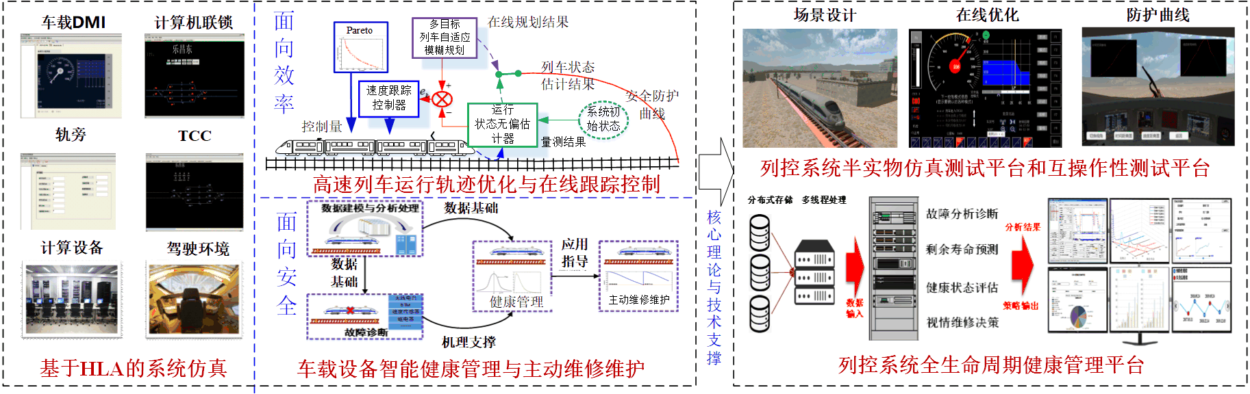 自主智能与无人系统研究中心面向高速铁路与城市轨道交通安全、高效、节能、舒适等多目标均衡运营需求,构建“动态间隔、弹性调整、及时安全”的理论体系,提出了列车自主运行优化与列车编队协同控制理论和方法,突破了面向自动驾驶的高速列车群虚拟重联运行控制优化关键技术难点,在仿真环境下实现多列列车安全、高效、节能、稳定编队运行,显著提升运行效率。团队设计了基于高层体系结构的列控系统仿真体系结构,构建了CTCS-3 级列车运行控制系统仿真、测试与验证平台,应用于京沪、武广高铁列控系统联调联试和互联互通测试,有力支撑了高速铁路的建设与发展。