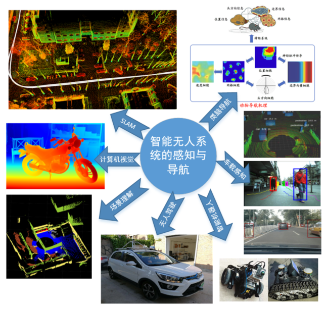 自主智能与无人系统研究中心针对复杂环境(如动态、弱纹理、大尺度环境)下的智能机器人的场景感知问题,从系统建模和非线性优化估计等角度研究提升机器人对场景感知的精度、可靠性的理论方法。研究领域包括复杂环境下多模态SLAM方法及建图一致性问题;智能无人系统的规划与导航问题;基于深度学习的目标检测、跟踪、语义分割;基于注意力机制的多模态轨迹预测规划方法;基于多智能体协同的感知、规划与控制;特定应用场景下的车路协同自动驾驶技术等。