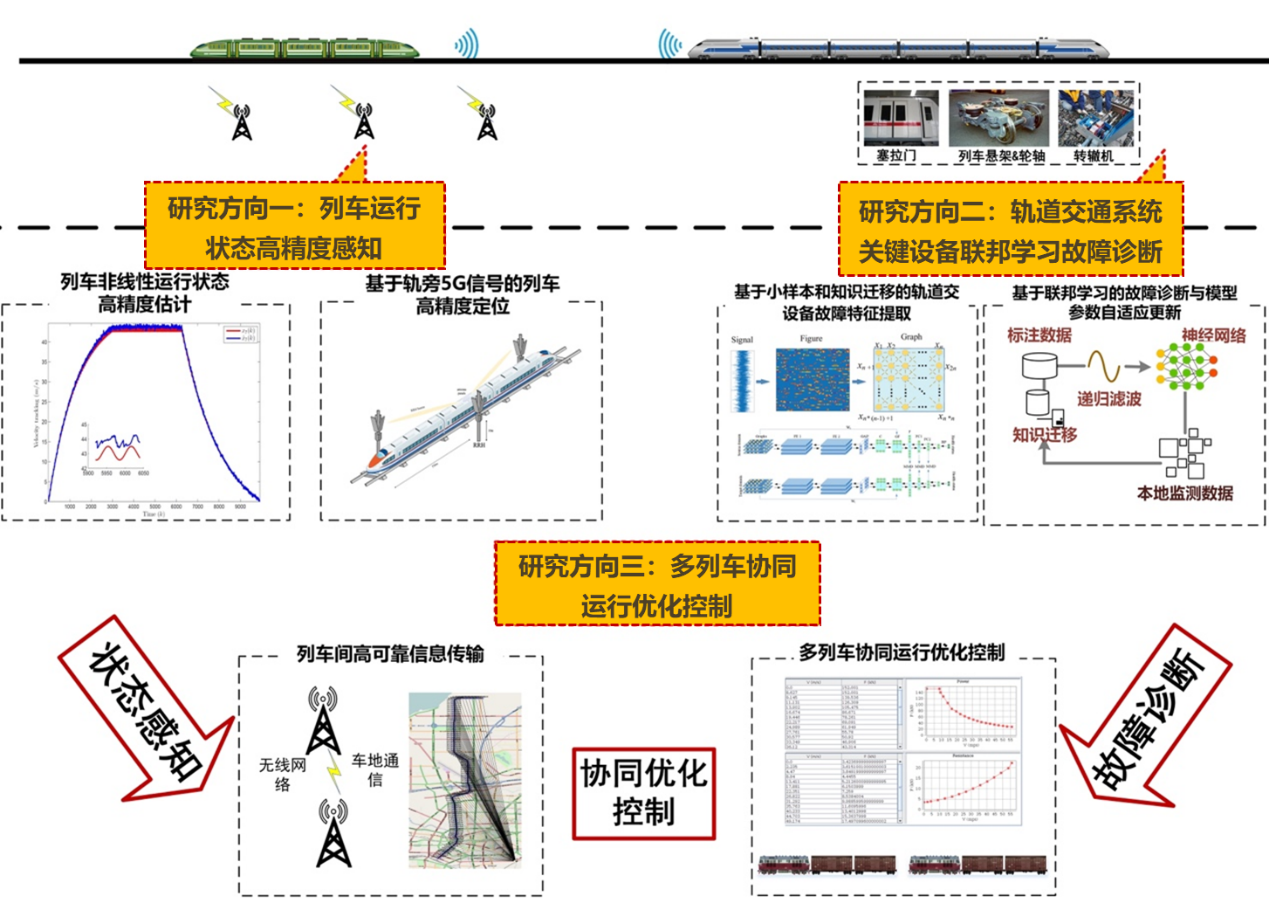 自主智能与无人系统研究中心聚焦轨道交通系统运行安全保障与优化控制中的实际需求,开展了列车运行状态高精度感知、轨道交通系统关键设备故障诊断、多列车协同优化控制等方面的研究,在所主持的国家自然科学基金重点国合、面上、青年项目,国家重点研发计划课题,中国科协“青年人才托举工程”项目等支持下,已取得一系列原创性研究成果:(1)提出了高速列车非线性运行状态高精度估计方法;(2)建立了小样本条件下轨道交通联邦学习故障诊断学习框架;(3)优化了虚拟编组场景下的多列车协同控制理论。部分研究成果已在我国铁路、城轨等轨道交通系统中得到应用。